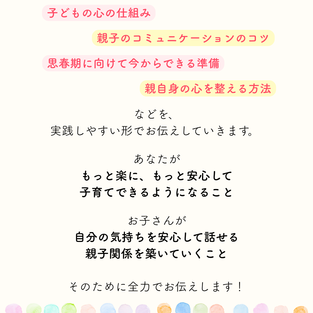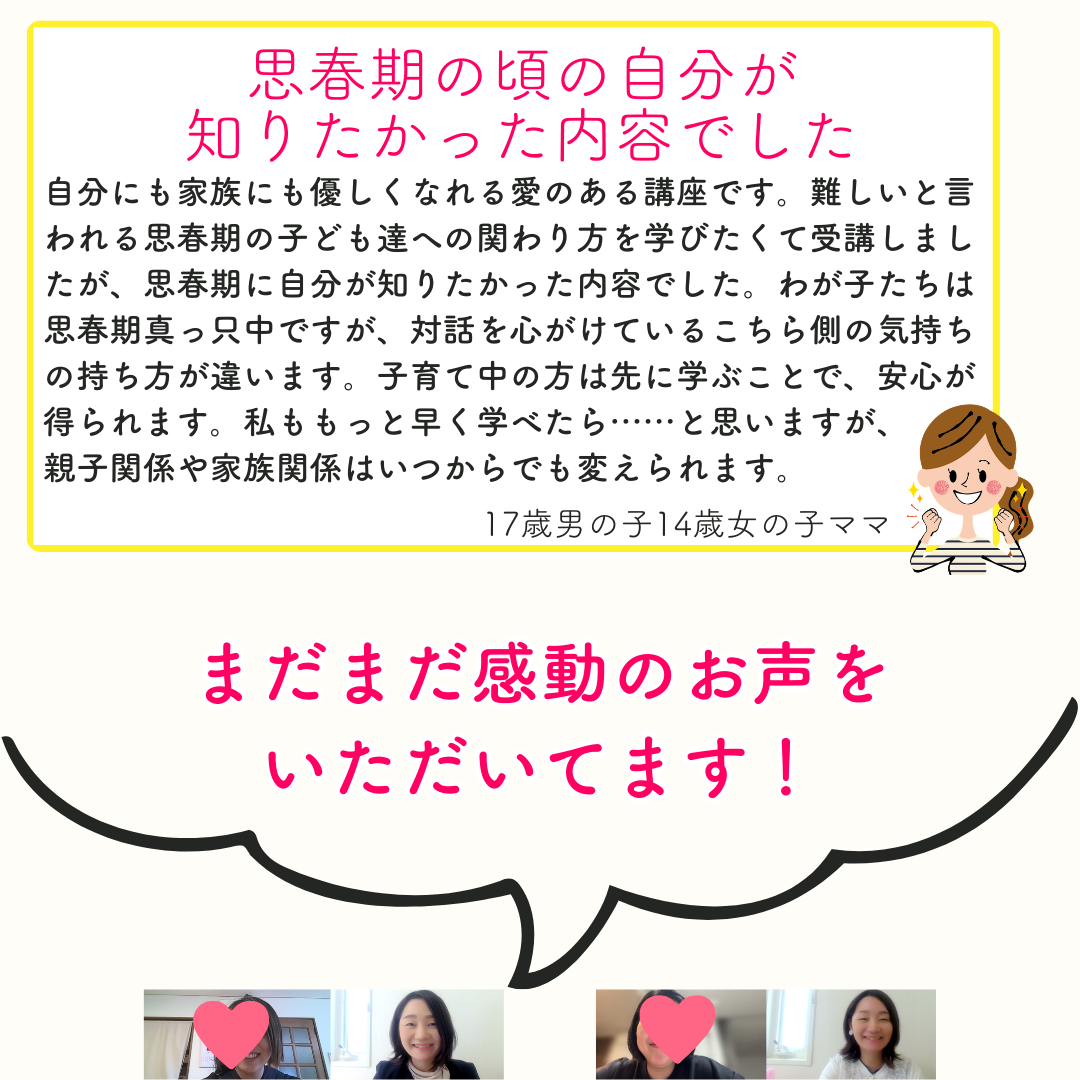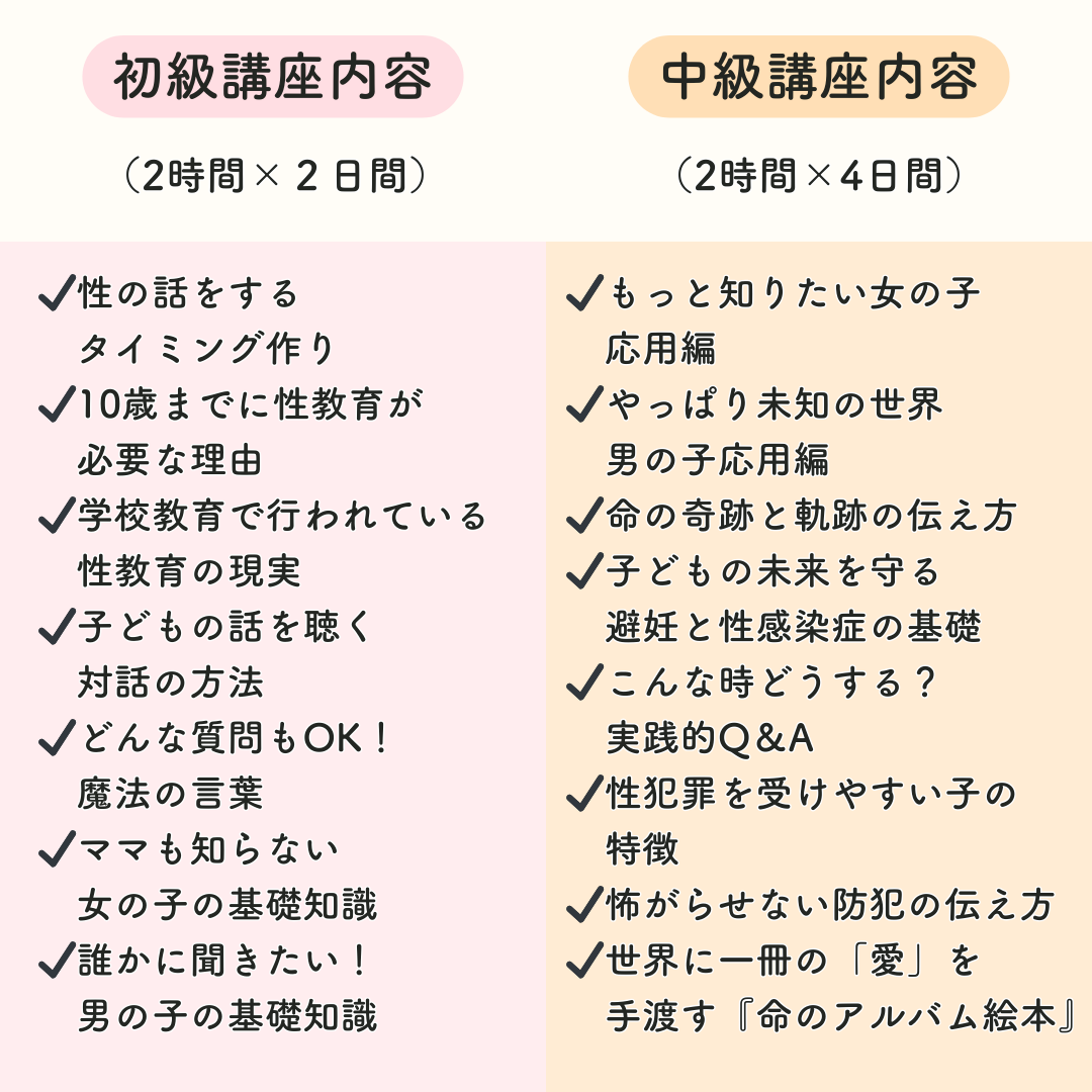 2時間×6日間の初級中級講座 2.5時間×7日間の思春期講座 |