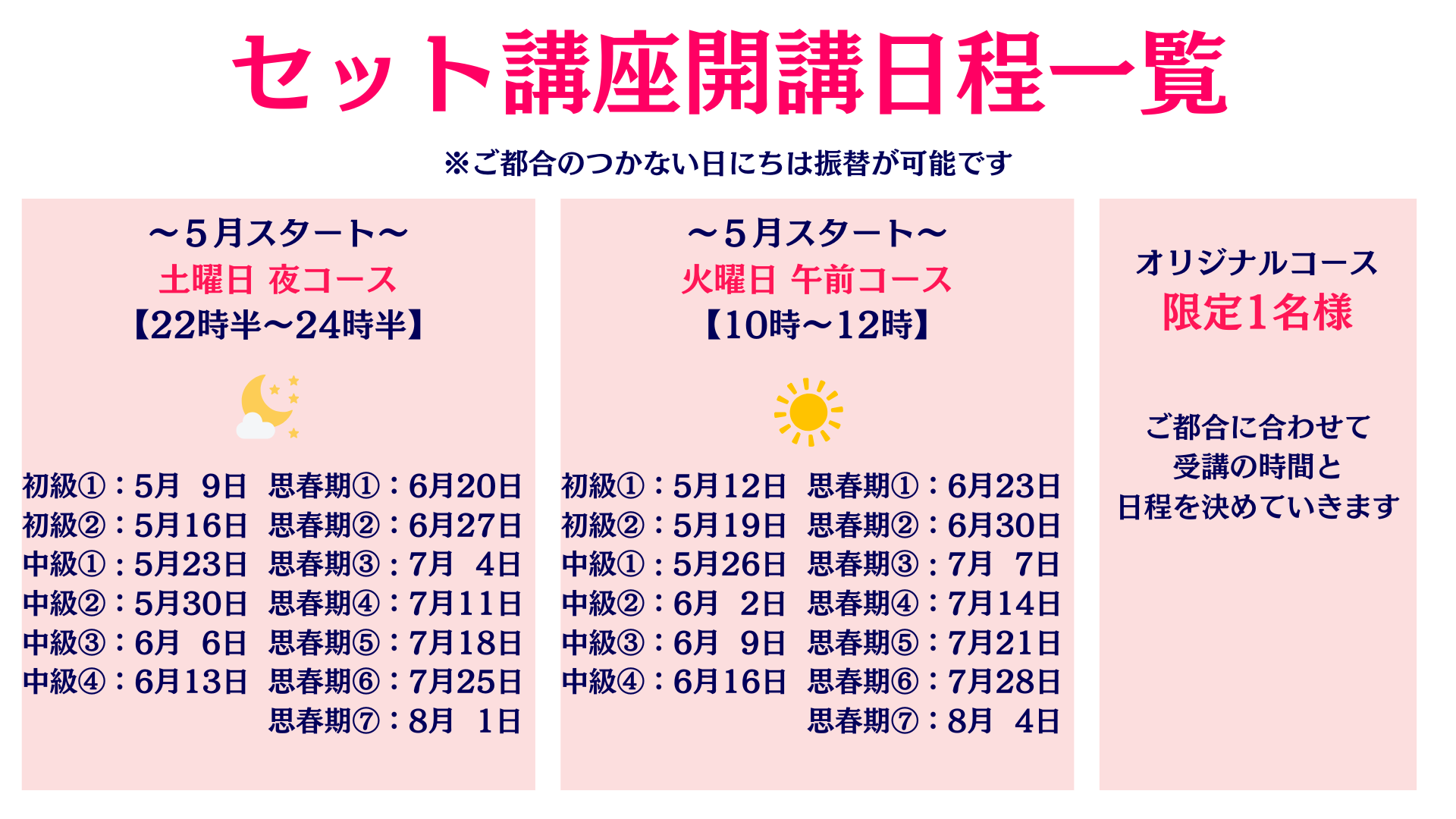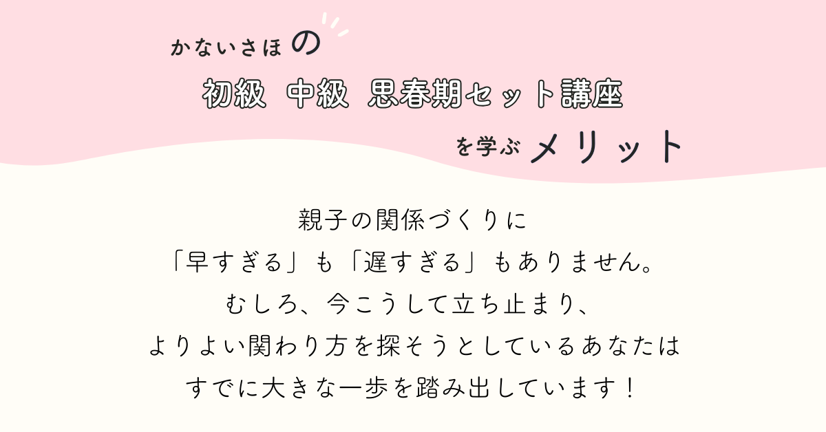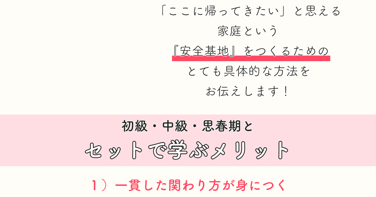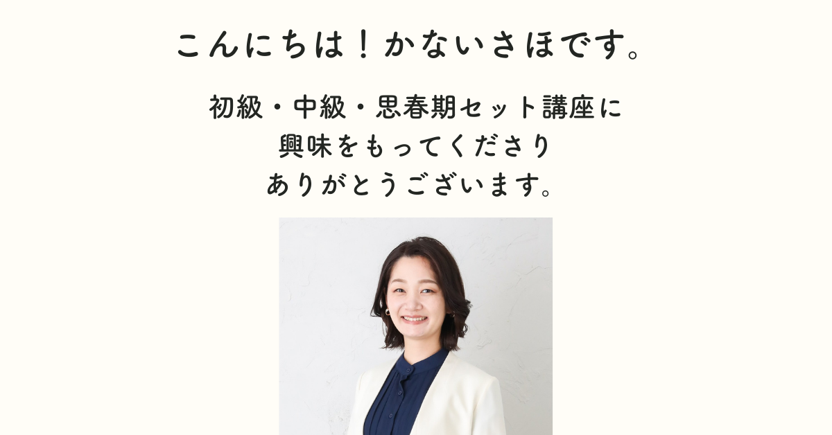 初級・中級講座(一般受講)>> 116,600円(税込)⇒105,600円(税込) ※11,000円引き(特典はございません)。 思春期講座(一般受講) >>165,000円(税込) ※割引・特典はございません。 初級・中級・思春期セット講座(一般受講)>> 281,600円(税込)⇒226,600円(税込) ※55,000円引き&特典付き |