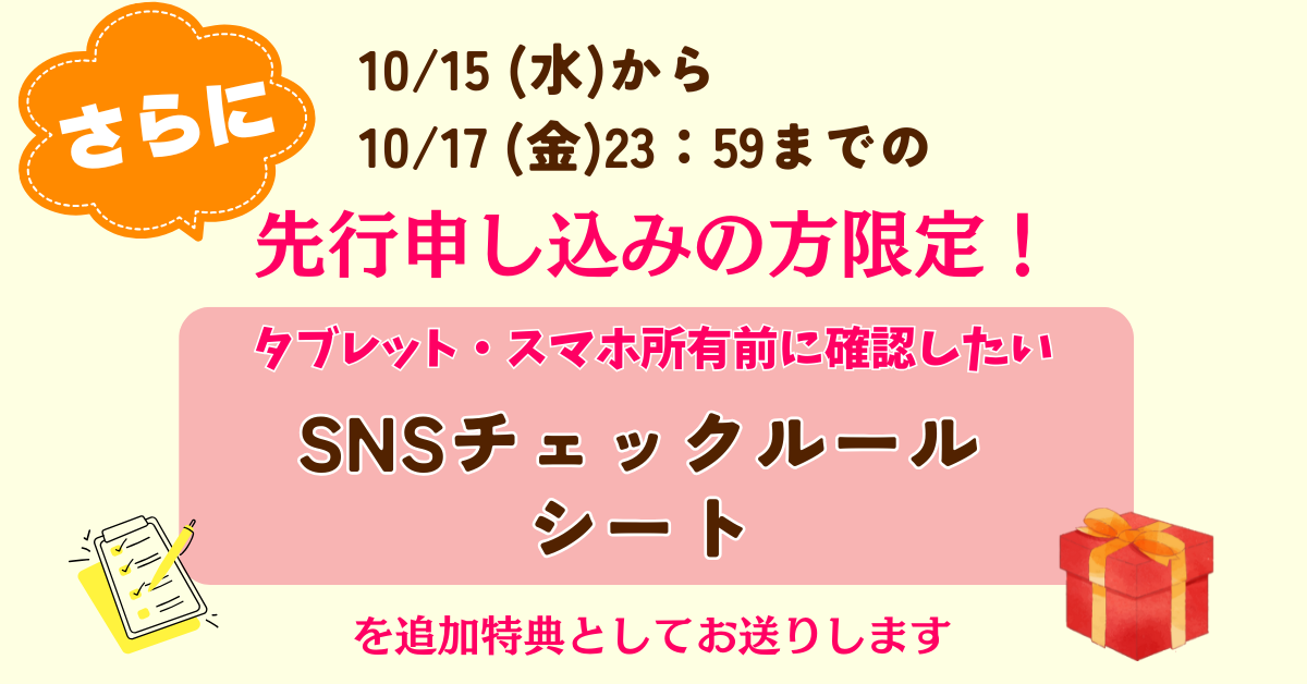 10/15(水)~10/17(金)23:59の 期間にお申込みの方には 冬休み中のSNSトラブル防止に役立つ SNSルールチェックシート が特典として付きます♪ |