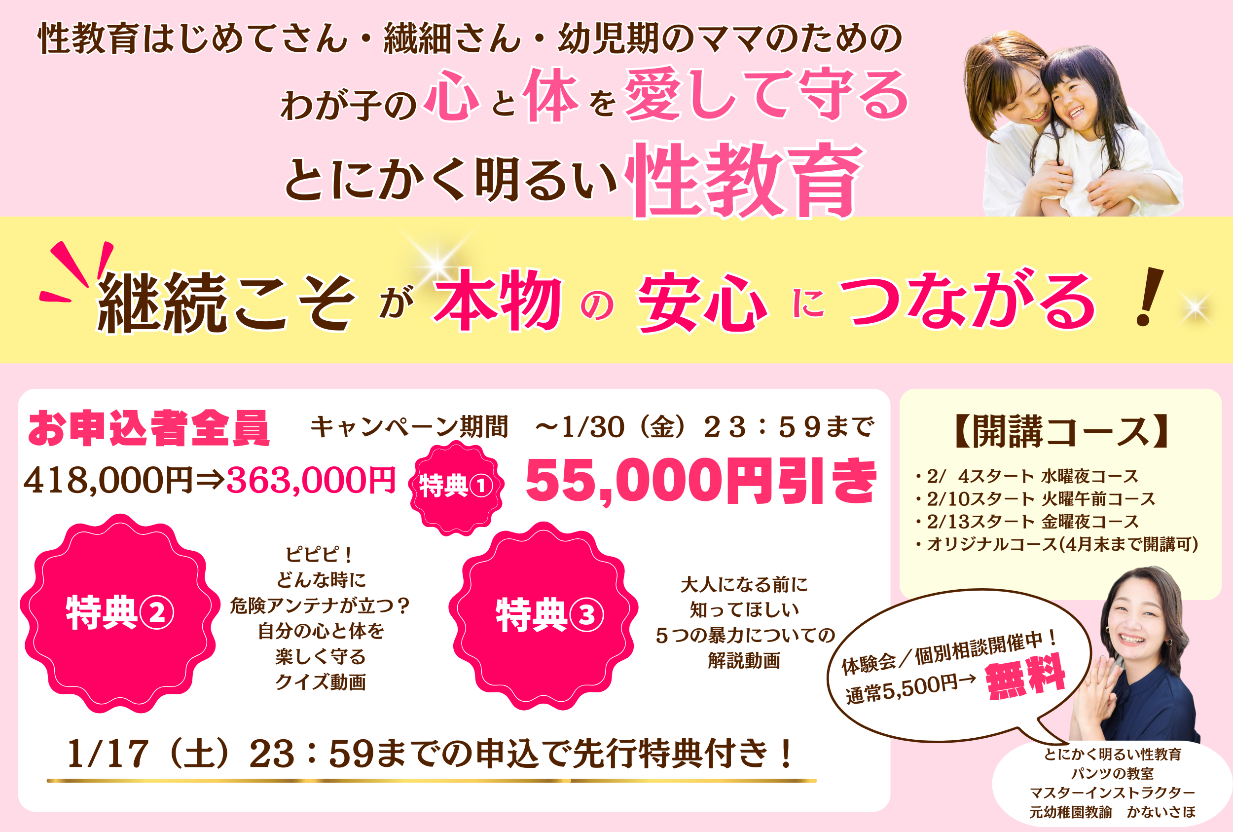 1月17日(土)23:59までのお申込で ★先行特典★ ・何度も受講できる♪ 男児女児トリセツ養成講座 (63,800円)ご招待 |